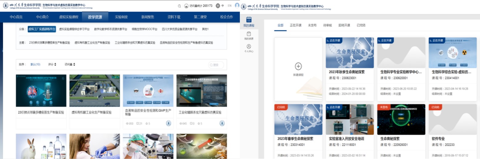 虚拟仿真实验教学中心网站平台教学资源及课程开设界面